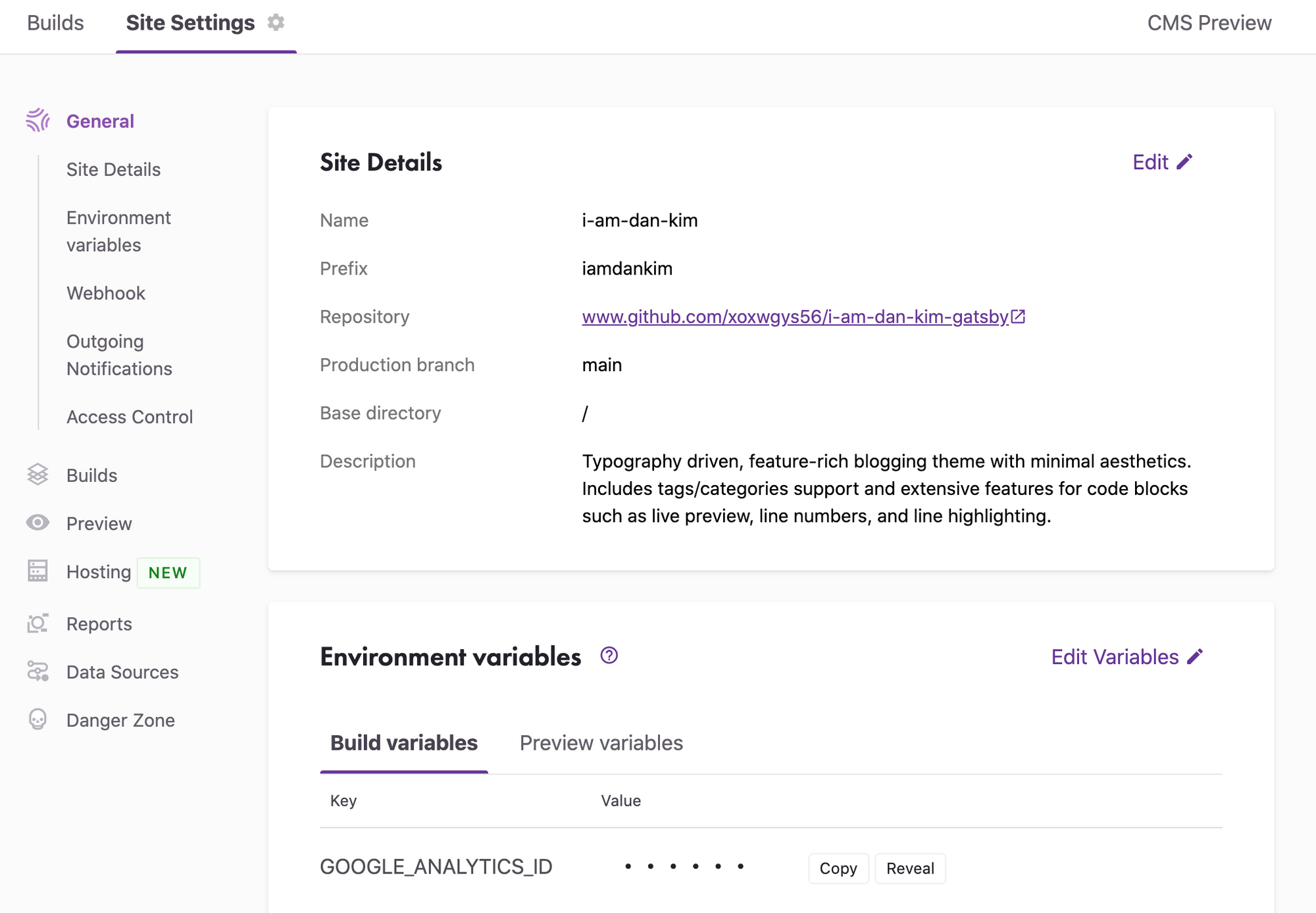 General로 이동해있을 것이다. 아래로 조금만 스크롤 다운하면,Environment variables가 보인다. 여기에GOOGLE_ANALYTICS_ID가 비어있을 것이다. (이 id를 얻는 방법은 구글에 찾아보면 잘설명한 글이 많으니 참조하길 바란다.) 추가하고 수동으로 빌드하여 빌드가 성공했는지 확인하기 바란다.추가 웹훅