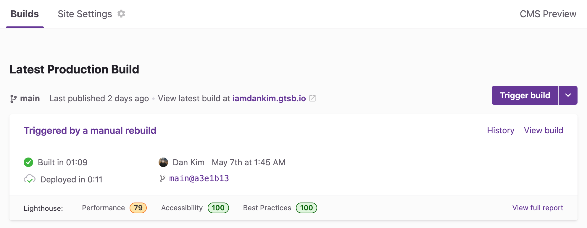 오른쪽의 보라색Trigger build버튼을 통해 수동으로 빌드할 수 있다.자동 빌드